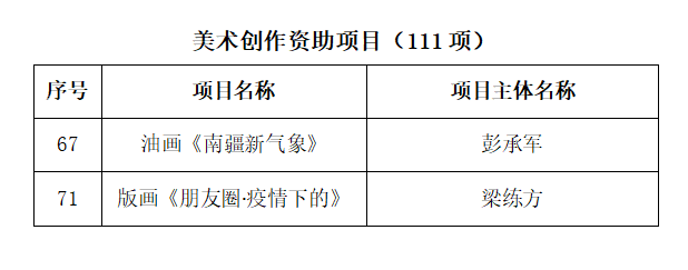 2023年3月,国家艺术基金管理中心公示了“国家艺术基金(一般项目)2023年度资助项目名单”。现已公示结束,beat365英国官网网站获批美术创作资助项目2项,分别是美术学院彭承军老师《油画<南疆新气象>》、梁练方老师《版画<朋友圈·疫情下的人们>》。国家艺术基金是旨在繁荣艺术创作、打造和推广精品力作、培养艺术人才、推进国家艺术事业健康发展的公益性基金,在业内具有较高的影响力,资助范围包括艺术的创作生产、宣传推广、征集收藏、人才培养等方面。