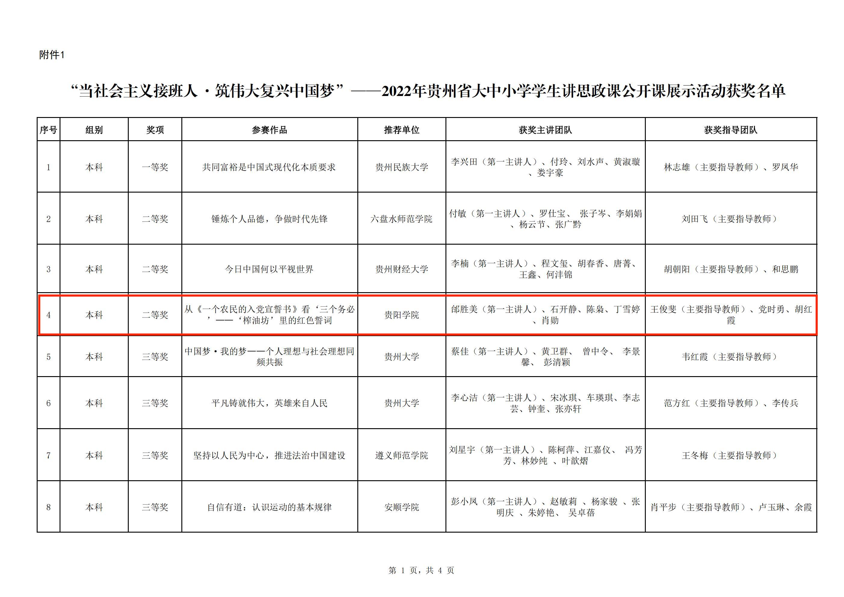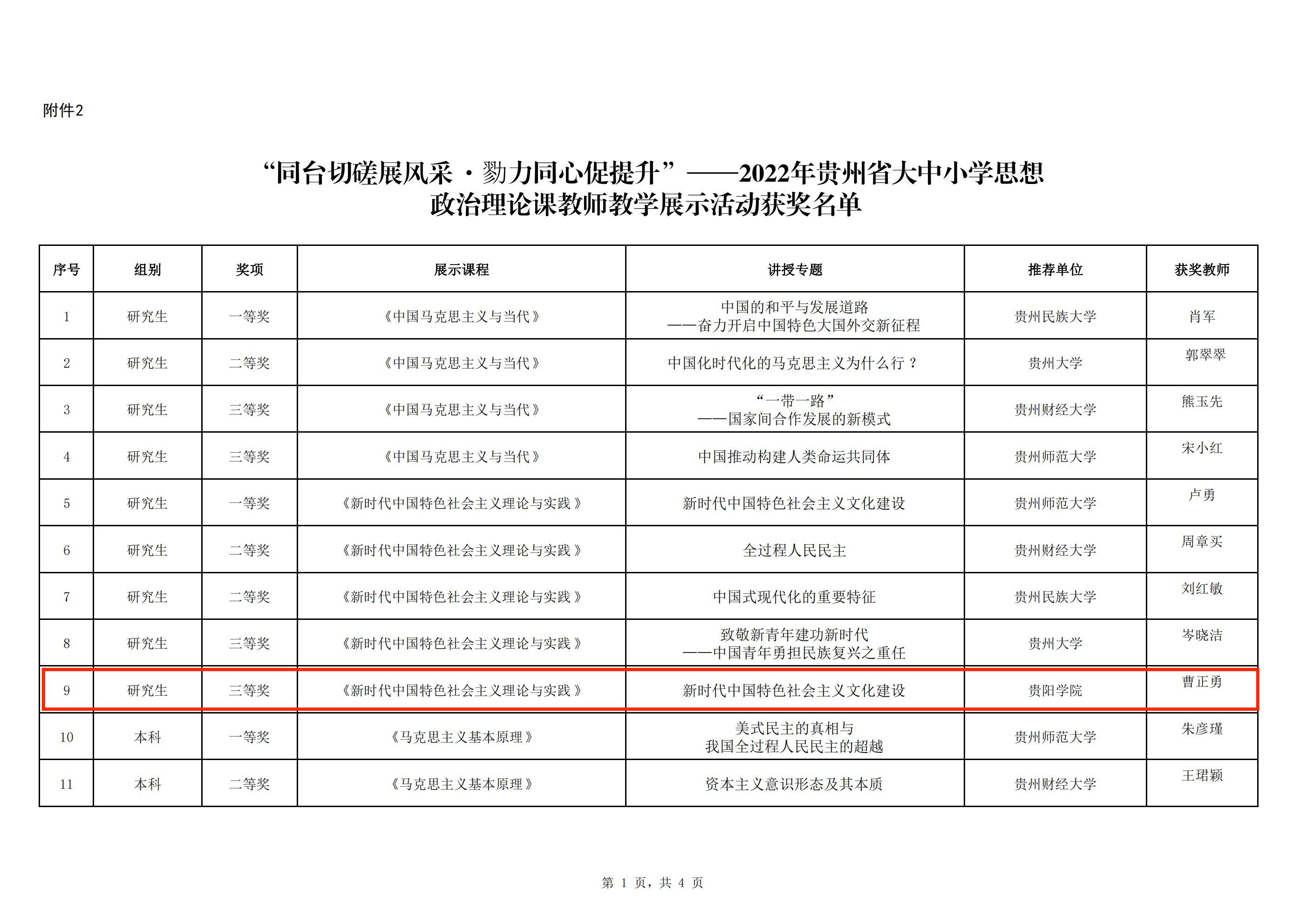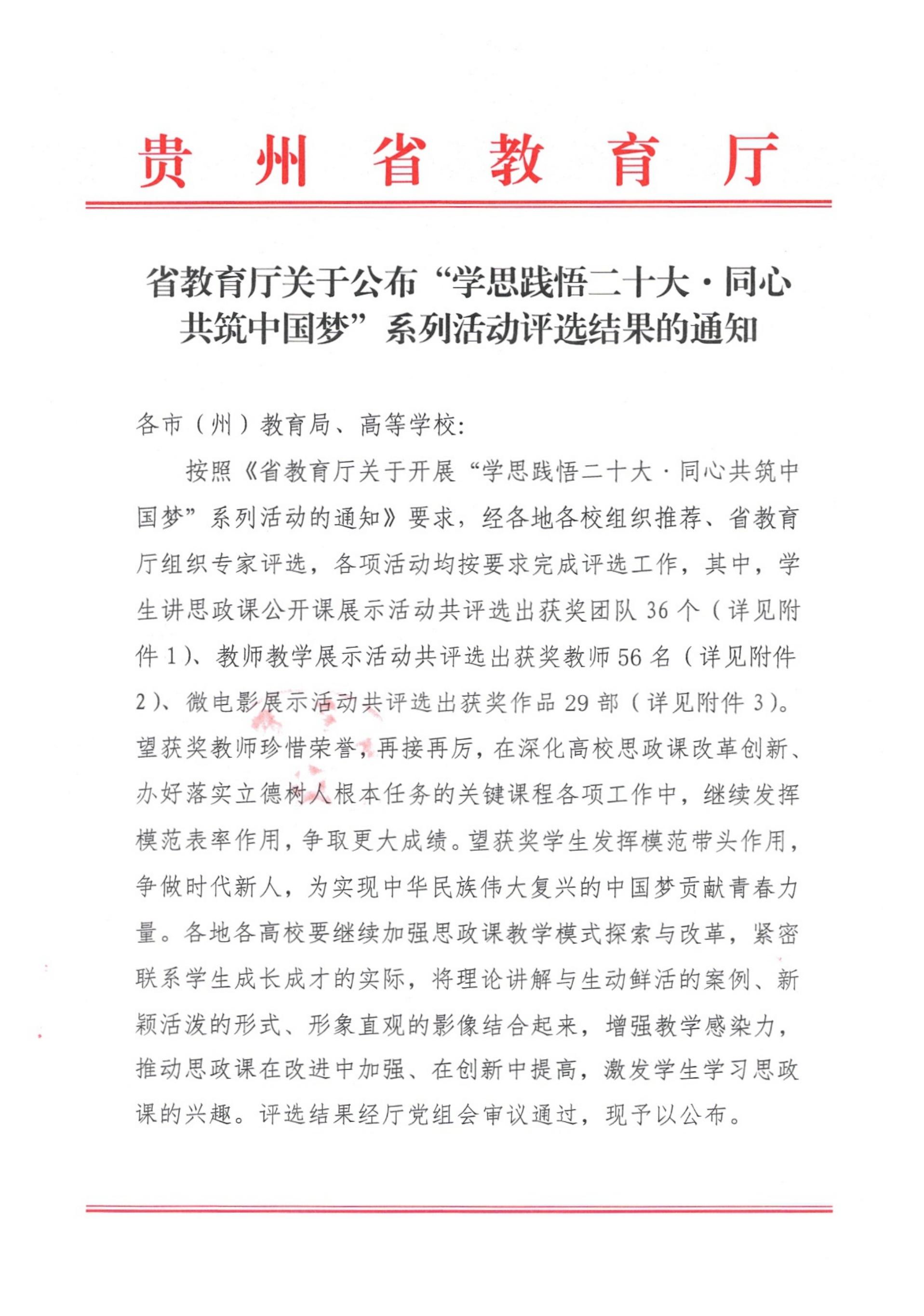 近日,贵州省教育厅公布了“学思践悟二十大·同心共筑中国梦”系列活动评选结果,beat365英国官网网站马克思主义学院学生邰胜美主讲的课程《从〈一个农民的入党宣誓书〉看“三个务必”——“榨油坊”里的红色誓词》获“当社会主义接班人·筑伟大复兴中国梦”——2022年贵州省大中小学学生讲思政课公开课展示活动二等奖。马克思主义学院教师曹正勇主讲的研究生课程《新时代中国特色社会主义理论与实践》荣获“同台切磋展风采·勠力同心促提升”——2022年贵州省大中小学思想政治理论课教师教学展示活动三等奖。