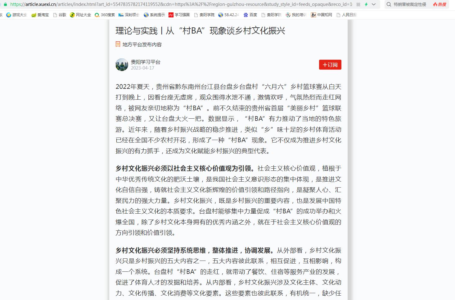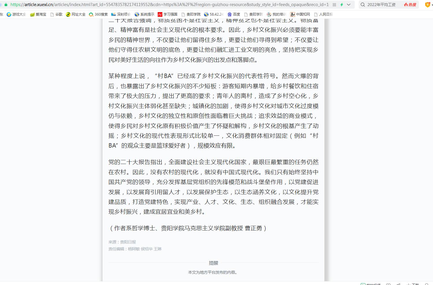 2023年4月17日,beat365马克思主义学院副教授曹正勇在贵阳日报发表的文章《从“村BA”现象谈乡村文化振兴》被“学习强国贵阳学习平台采用。