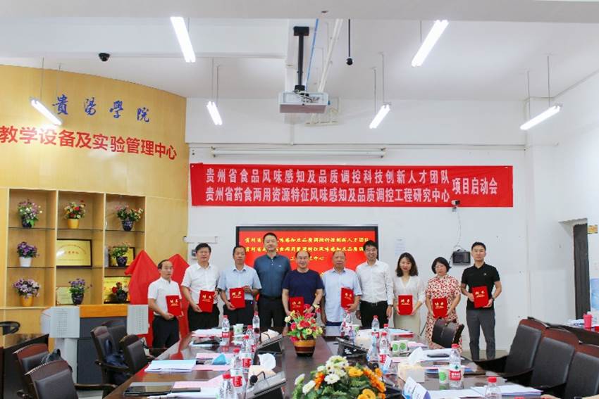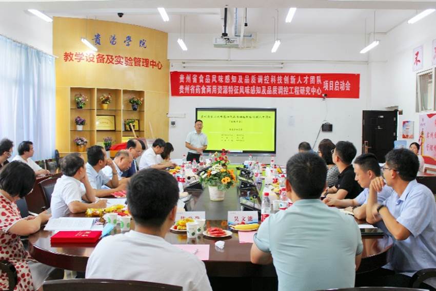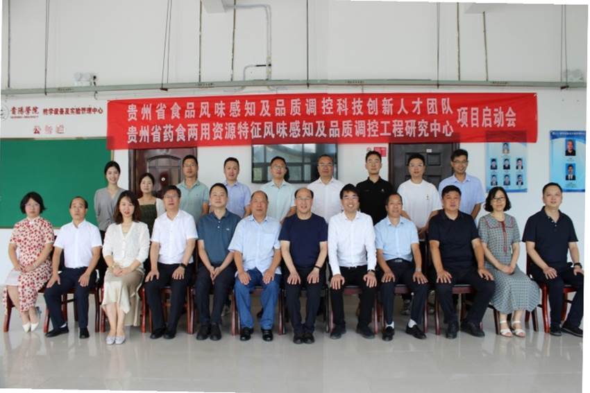 2023年8月20日,由贵州省科学技术厅批准立项建设的贵州省食品风味感知及品质调控科技创新人才团队,贵州省教育厅批准立项建设的贵州省高等学校药食两用资源特征风味感知及品质调控工程研究中心启动会在学校顺利召开。贵州省教育厅科技处三级调研员张磊,beat365英国官网网站党委委员、副校长李灿,中国农业大学食品科学与营养工程学院院长廖小军,原贵州省农业科学院党委书记、院长赵德刚,贵州大学教育部长江学者特聘教授杨富裕,上海交通大学农业与生物学院食品科学系主任、宁夏大学食品科学与工程学院院长、国家优秀青年基金获得者刘源,中国农业科学院农业质量标准与检测技术研究所研究员、国家优秀青年基金获得者徐贞贞,贵州大学精细化工研究开发中心教授臧连生、甘秀海,贵州大学茶学院教授赵懿琛等专家出席会议。beat365英国官网网站食品科学与工程学院党委书记谢玲、院长马立志,创新人才团队和工程研究中心主要成员和研究生代表等40余人参加会议。会议由beat365英国官网网站科研处处长王瑞主持。