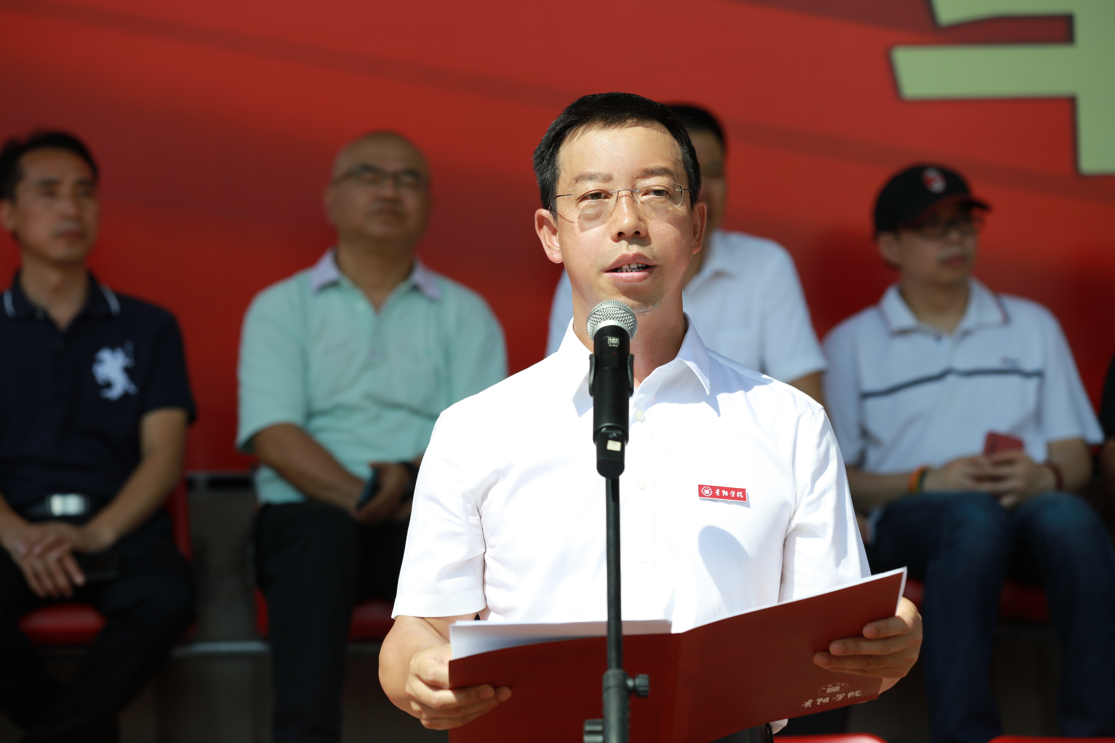 邓朝勇代表学校,向新同学表示祝贺和欢迎,同时向新生的家长、老师以及承担军训任务的武警贵阳支队全体教官表示衷心的感谢。他作了题为“追光逐梦谱写新时代青春华章”的讲话,对新生提出三点建议:一是博学笃行,全面发展,做到求学要专注,求知要勤奋,读书要“广博”;二是勇于探索,开拓创新,在学习中培养创新意识,保持探索未知的好奇心,养成勤思考、爱钻研的好习惯,敢为人先,敢于突破;三是志存高远,担当使命,坚定理想信念,自觉树立正确世界观、人生观、价值观,厚植家国情怀、勇担时代使命,把自己的理想抱负同祖国的前途命运紧密联系起来,扎根人民,奉献国家,在新征程上激昂青春之志,奉献青春之力,谱写更加壮美的青春之歌。