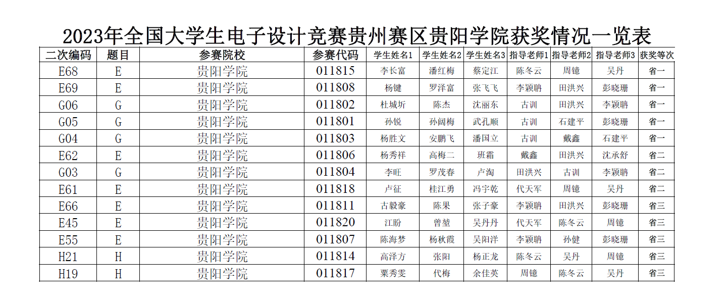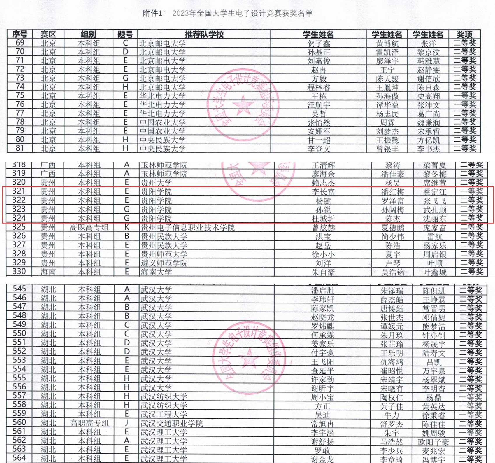 2023年9月10日,第十六届全国大学生电子设计竞赛(TI杯)全国总决赛获奖名单正式公布,学校电子信息工程学院学子荣获全国一等奖1项、二等奖3项,贵州赛区一等奖5项、二等奖3项、三等奖5项成绩,这是贵州省高校在历届全国大学生电子设计竞赛中取得的最好成绩。