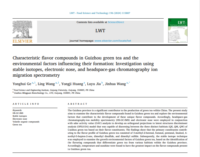 近日,学校食品科学与工程学院葛永辉副教授团队在国际知名期刊LWT-Food Science and Technology(中科院1区top期刊)发表题为“Characteristic flavor compounds in Guizhou green tea and the environmental factors influencing their formation: Investigation using stable isotopes,electronic nose,and headspace-gas chromatography ion migration spectrometry”的研究论文。该期刊为中科院1区Top期刊,beat365葛永辉副教授为第一作者,王金华正高级实验师为通讯作者,beat365英国官网网站为第一单位。