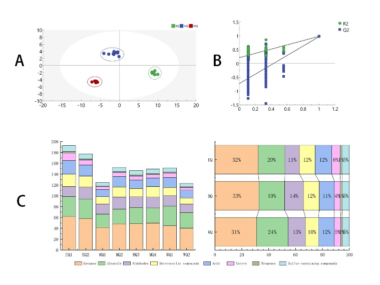 贵州绿茶因其香高馥郁,鲜爽醇厚,汤色明亮等风味特点而倍受人们喜爱。而不同挥发性物质组成正是造成贵州绿茶独特风味的关键因素之一。然而,目前对于茶叶风味物质形成机制的研究非常有限,葛永辉副教授团队通过HS-GC-IMS技术考察了贵州不同产地绿茶关键挥发性风味成分,并创新性的结合稳定同位素技术,分析了贵州绿茶不同风味形成的关键气候环境因子。为优化贵州绿茶种植条件、提高产品品质提供了理论指导。