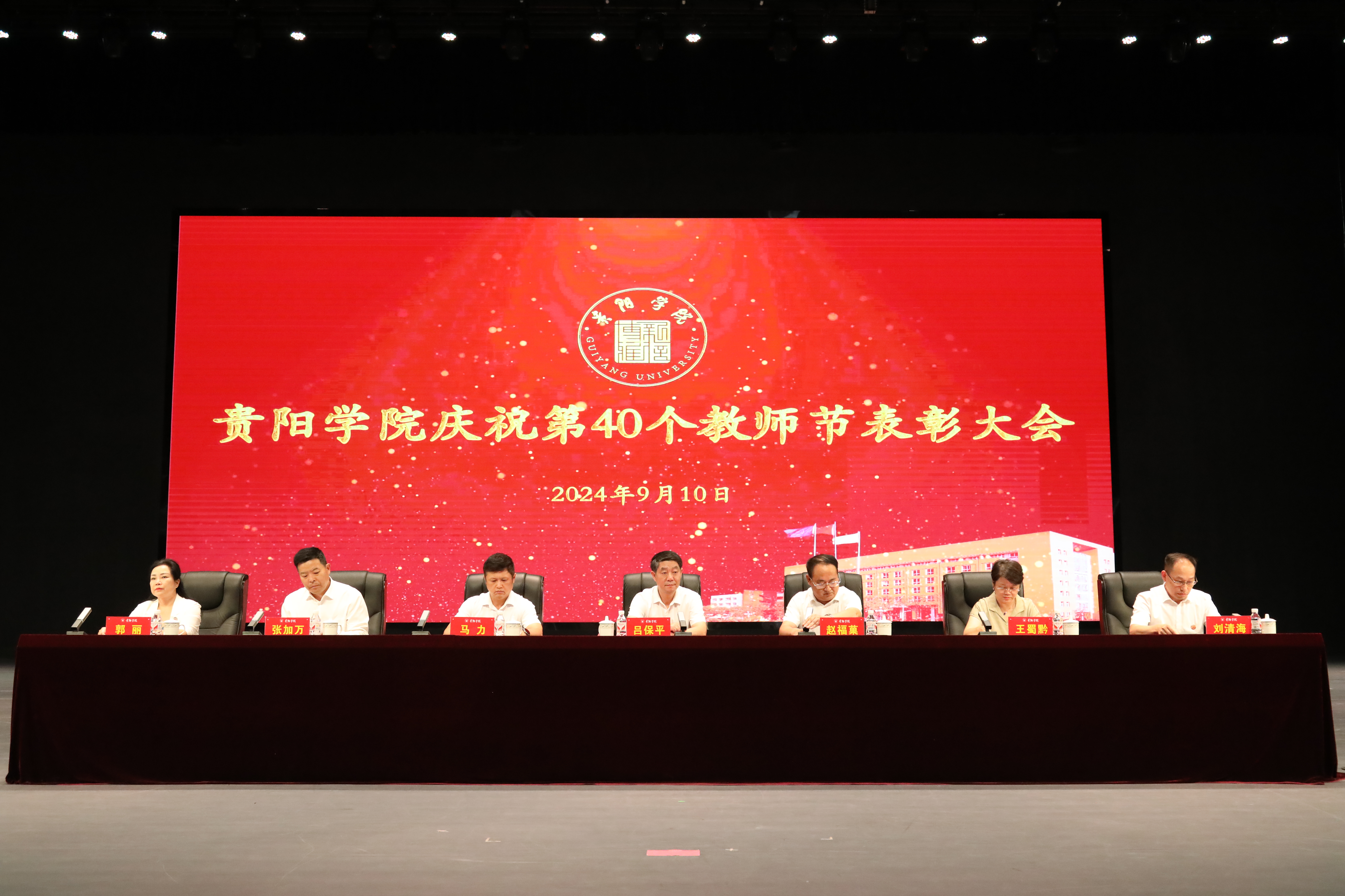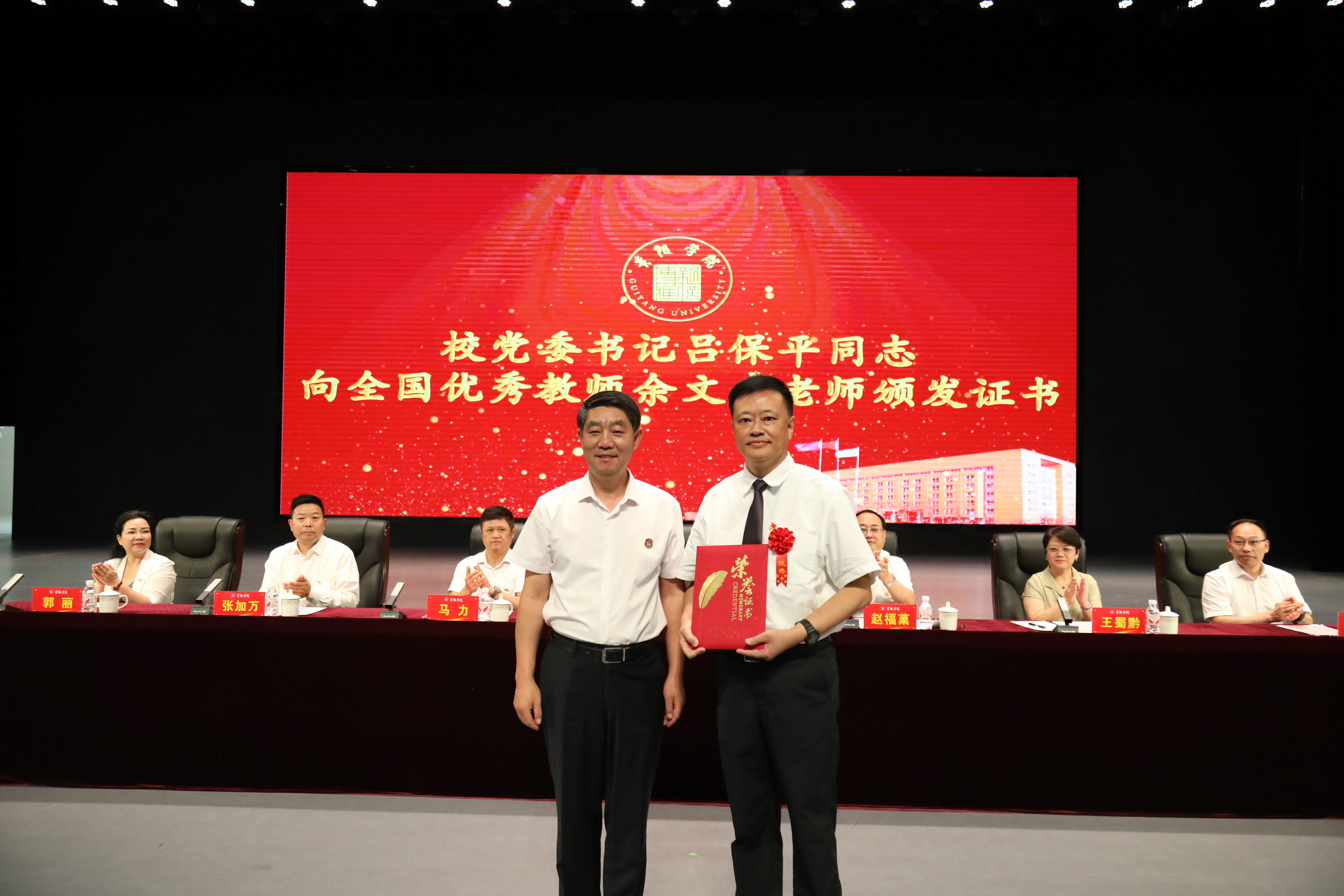校党委书记吕保平,校领导赵福菓、马力、王蜀黔、张加万、刘清海、郭丽出席表彰大会并讲话,赵福菓主持大会,会议在庄严的中华人民共和国国歌声中拉开帷幕。大会上,马力宣读了全国优秀教师获得者名单,刘清海宣读了省级“金师”(教学名师)表彰决定,王蜀黔宣读了优秀教师、优秀教育工作者表彰决定,张加万宣读了优秀辅导员表彰决定。校领导向获得表彰的教职工颁发了获奖证书。