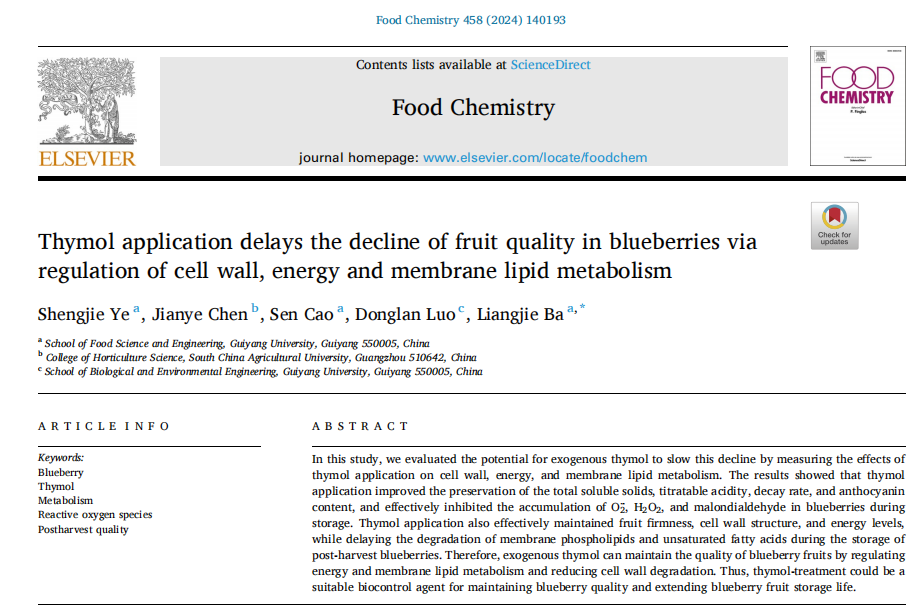 近日,学校食品科学与工程学院巴良杰教授团队在国际知名期刊Food Chemistry(中科院1区top期刊)发表题为“Thymol application delays the decline of fruit quality in blueberries via regulation of cell wall, energy and membrane lipid metabolism”的研究论文。学校2022级生物与医药专业硕士研究生叶盛洁为第一作者,巴良杰教授为通讯作者,beat365英国官网网站为第一单位。