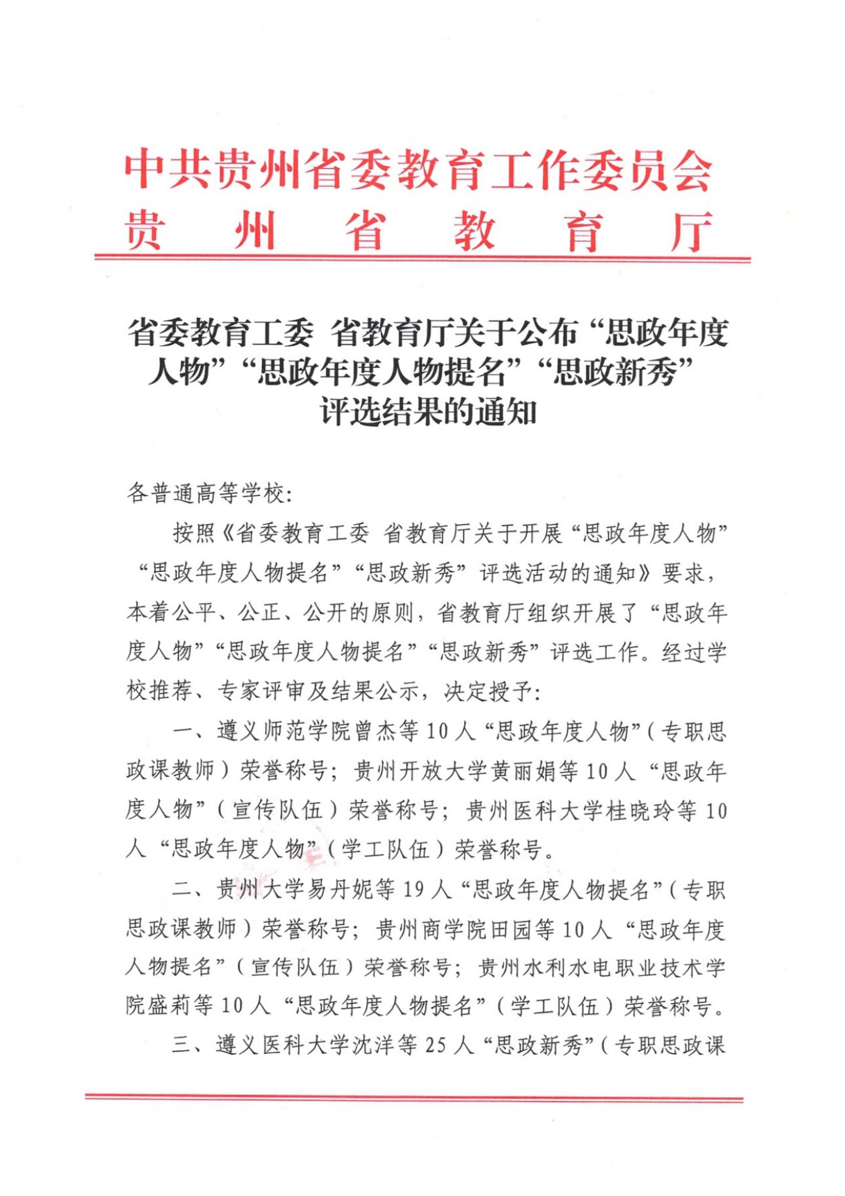 近日,省委教育工委、省教育厅正式印发《省委教育工委 省教育厅关于公布“思政年度人物”“思政年度人物提名”“思政新秀”评选结果的通知》,beat365沈雪蓓老师获“思政年度人物(专职思政课教师)”、熊姗姗老师获“思政年度人物提名(宣传队伍)”、蒋泽标老师获“思政年度人员(学工队伍)”、唐薇老师获“思政新秀(宣传队伍)”、郑传捷老师获“思政新秀(学工队伍)”。