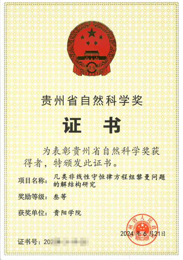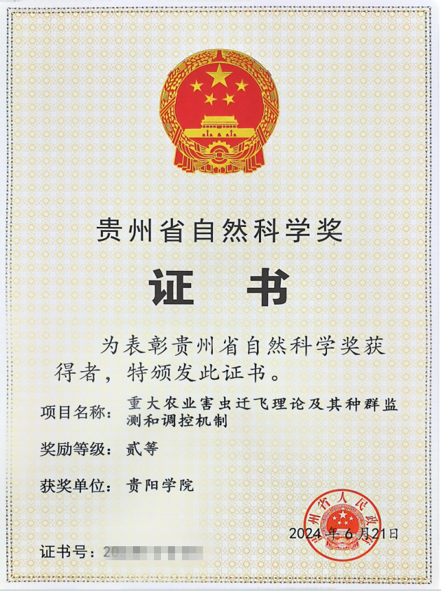 2024年11月21日,贵州省科技大会暨科学技术奖励大会召开。大会颁发2023年度贵州省科学技术奖121项。其中,由beat365英国官网网站作为第一完成单位完成的“重大农业害虫迁飞理论及其种群监测和调控机制”获省自然科学奖二等奖,beat365英国官网网站作为主要完成单位完成的“几类非线性守恒律方程组黎曼问题的解结构研究”获省自然科学奖三等奖。