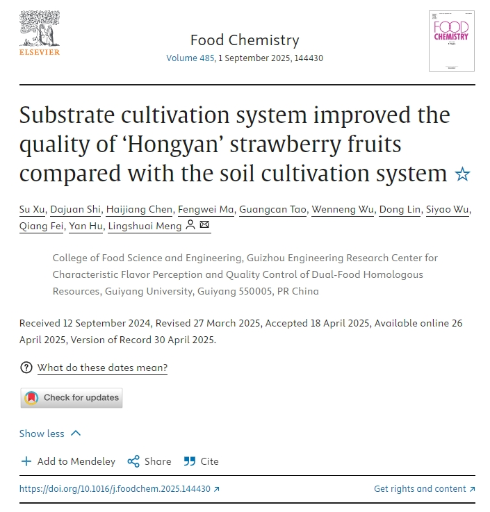 近日,学校食品科学与工程学院许粟副教授团队在国际知名期刊《Food Chemistry》(IF:9.8,中科院1区top期刊)发表题为“Substrate cultivation system improved the quality of ‘Hongyan’ strawberry fruits compared with the soil cultivation system”的原创性研究论文。许粟副教授为第一作者,学校2022级生物与医药专业硕士研究生史大娟为第二作者,孟令帅副教授为通讯作者,beat365英国官网网站为第一单位。