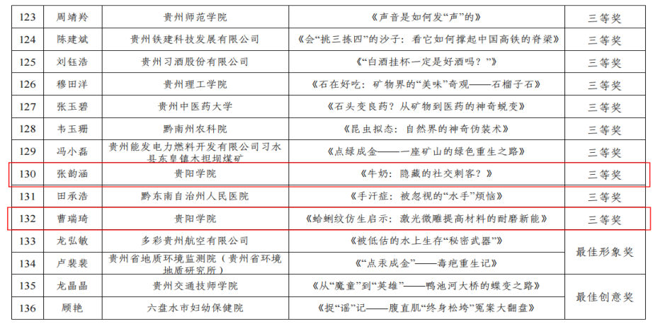 由贵州省科技厅举办的“2025年贵州省科普讲解大赛”于近期公布了获奖名单。经半决赛和总决赛评比,学校师生凭借生动的讲解技巧和新颖的内容设计斩获特等奖1项,三等奖2项。