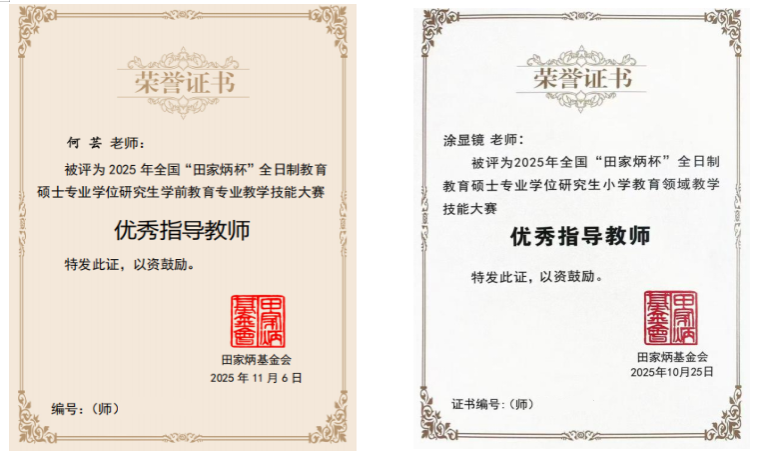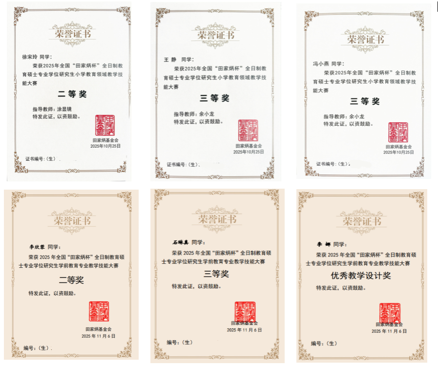2025年11月,全国“田家炳杯”全日制教育硕士专业学位研究生教学技能大赛圆满落幕。学校教育科学学院2024级6名教育硕士研究生,与全国各高校优秀学子同台竞技、激烈比拼后表现突出,获2项二等奖、3项三等奖和1项优秀教学设计奖,彰显了beat365学子扎实的专业素养与出色的教学能力,教育科学学院硕士生导师何芸、涂显镜获“优秀指导教师奖”,为学校赢得了荣誉。
