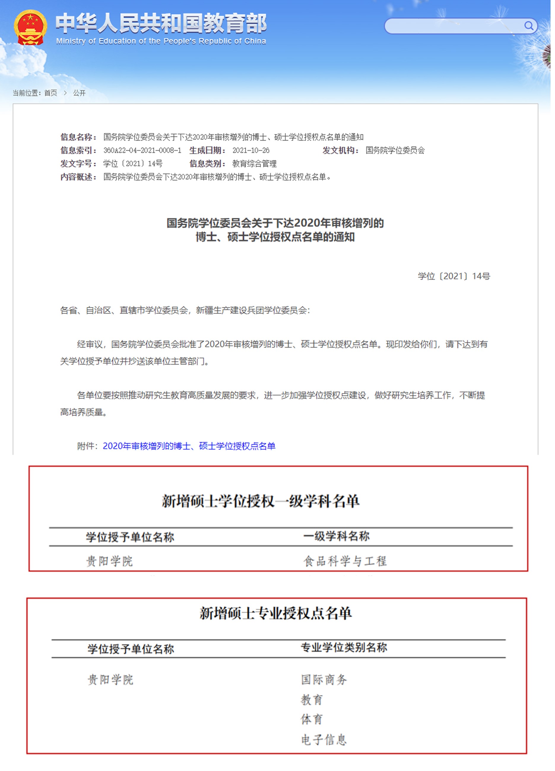 日前,国务院学位委员会下发了《关于下达2020年审核增列的博士、硕士学位授权点名单的通知》(学位〔2021〕14号),其中beat365英国官网网站获得1个一级学科硕士点食品科学与工程和4个专业学位硕士点,分别是:电子信息、国际商务、教育和体育。