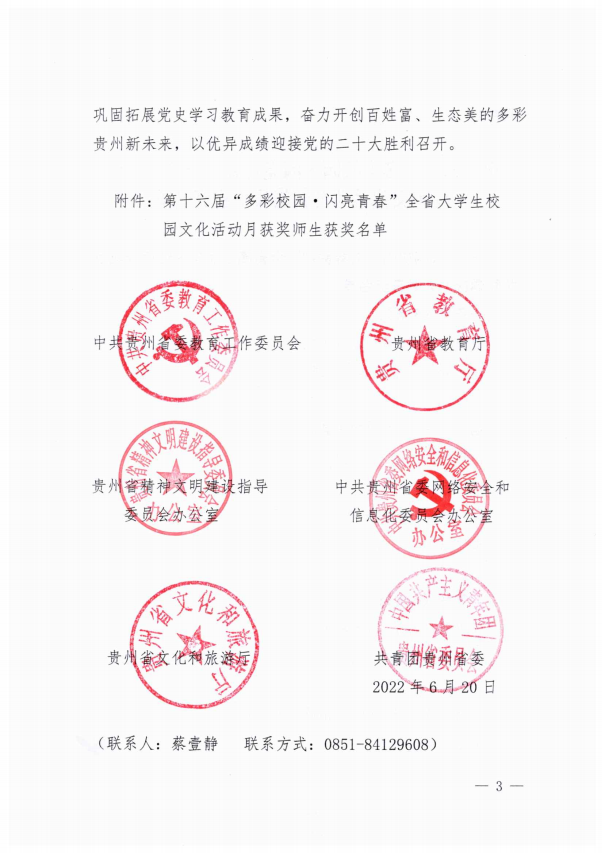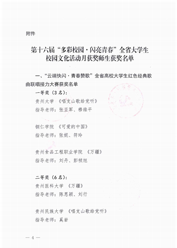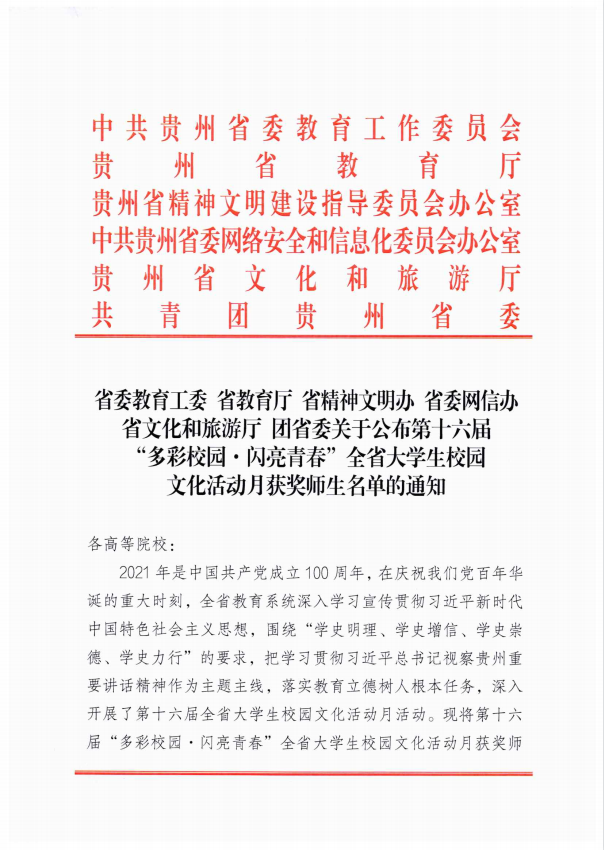 近日,接《省委教育工委 省教育厅 省精神文明办 省委网信办 省文化和旅游厅 团省委关于公布第十六届“多彩校园·闪亮青春”全省大学生校园文化活动月获奖师生名单的通知》,beat365教师彭麟、蒲紫嫣指导的歌曲联唱《灯火里的中国》荣获二等奖。