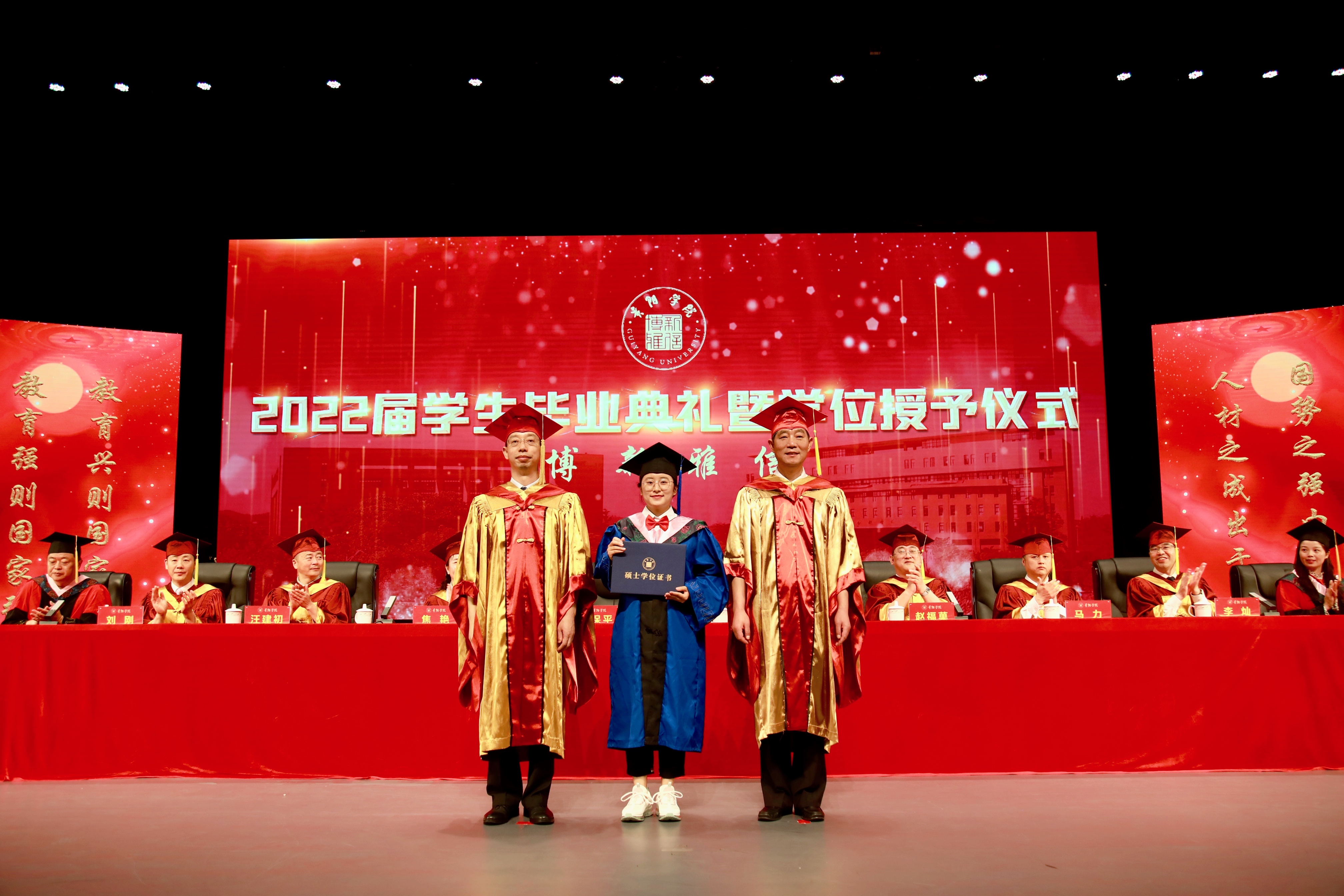 典礼现场,吕保平、邓朝勇逐一为29名首届全日制硕士研究生颁授学位证书、拨穗、合影,并为2022届本科毕业生代表授予学位证书,对67名省级优秀大学毕业生、101名校级优秀大学毕业生予以表彰。