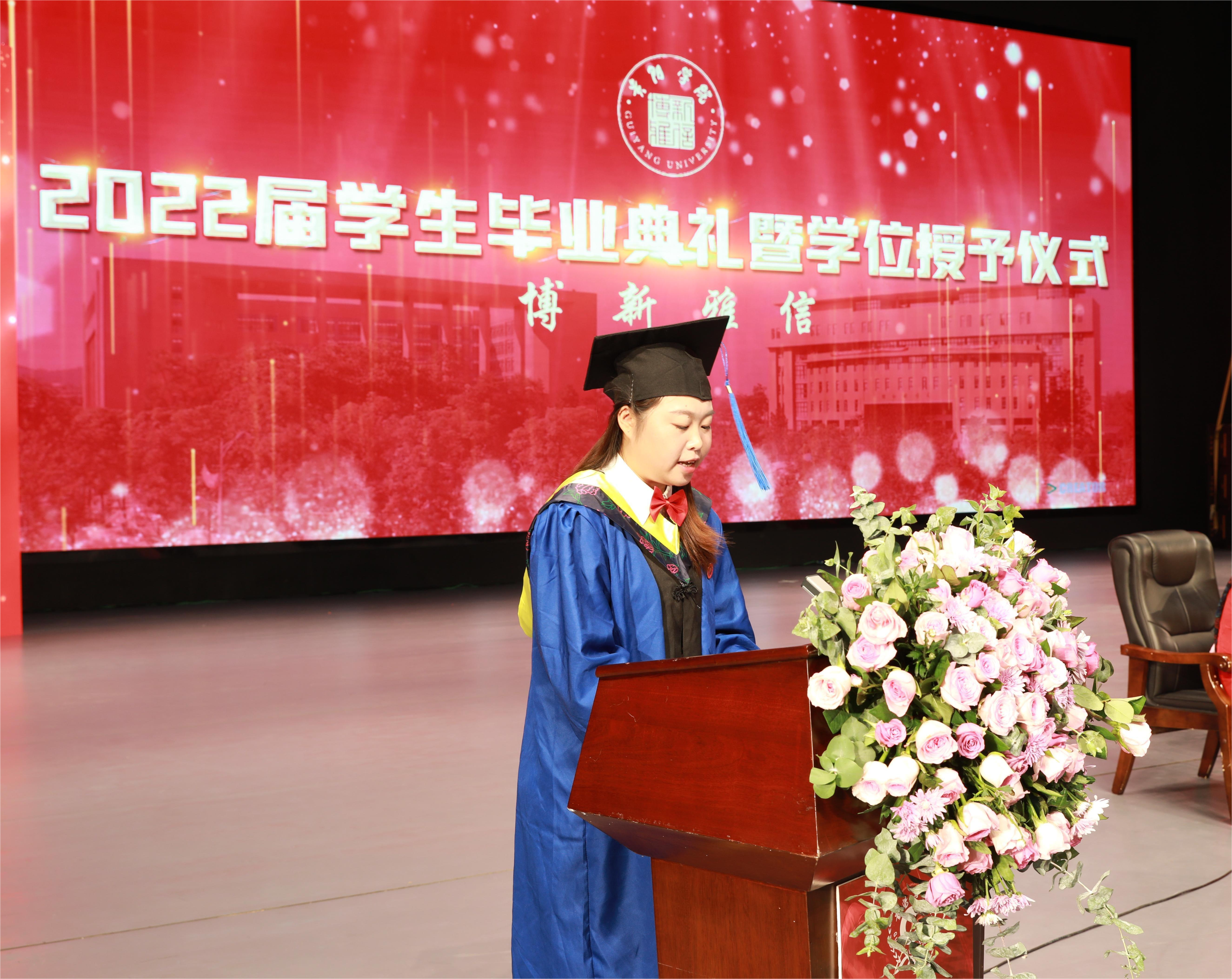 文化传媒学院18级广播电视编导专业的喻跃作为2022届本科毕业生代表发言。他说:“在将来,我无论身处何处,我都会骄傲的告诉别人,我是贵院传媒人,我在beat365英国官网网站成长,我从beat365英国官网网站出发!beat365英国官网网站,谢谢您的陪伴!希望我们一起乘风破浪,披荆斩棘向未来!衷心祝愿母校明天更加灿烂辉煌。感谢给予过帮助的所有老师们,祝愿每一位老师身体健康、工作顺利。”