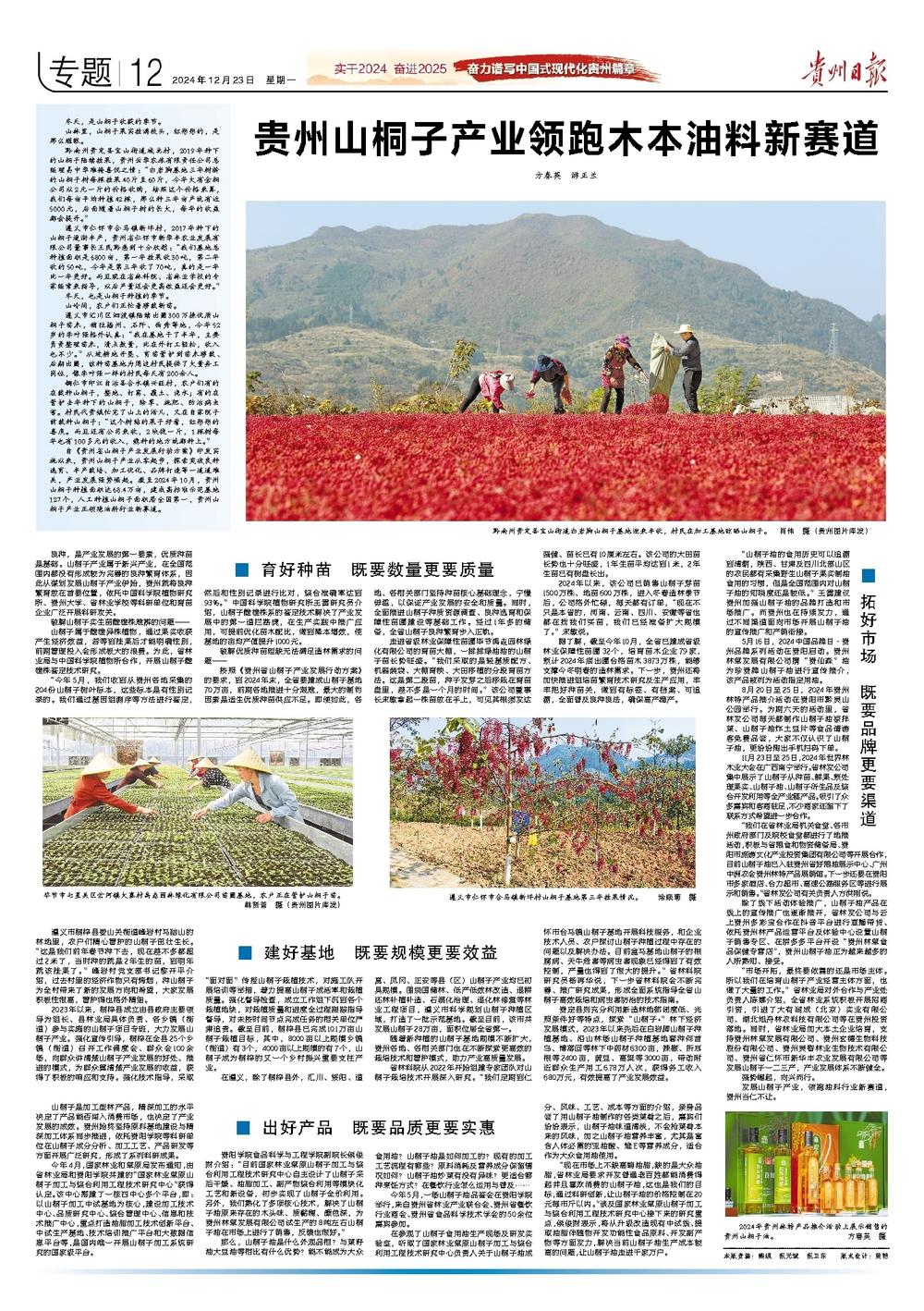 自《贵州省山桐子产业发展行动方案》印发实施以来,贵州山桐子产业从零起步,探索突破良种选育、丰产栽培、加工优化、品牌打造等一道道难关,产业发展强势崛起。截至2024年10月,贵州山桐子种植面积达68.4万亩,建成高标准示范基地127个,人工种植山桐子面积居全国第一,贵州山桐子产业正领跑油料行业新赛道。