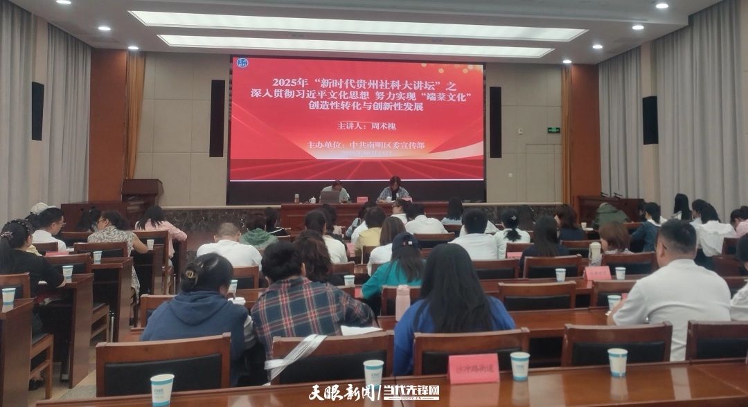 10月13日下午,根据省社科联“新时代贵州社科大讲坛”专题讲座项目要求,beat365英国官网网站“端棻文化”研究知名专家周术槐教授前往贵阳市南明区开展宣讲,此次宣讲的主题是“深入贯彻习近平文化思想,努力实现‘端棻文化’创造性转化与创新性发展”。本次活动是2025年省社科联批准立项的全省“新时代贵州社科大讲坛”立项项目。周术槐教授作为该项目的主持人,全程负责该项目的策划、设计、论证与申报工作。