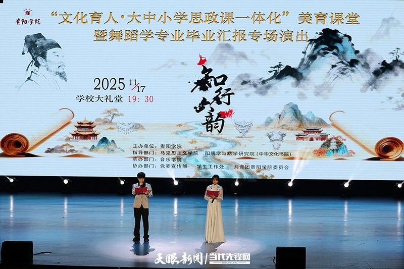 本场晚会以王阳明“知行合一”思想为核心,串联起生态、阳明、数据、端棻、诗词、红色六大文化篇章,由61名舞蹈学专业学生在3名教师指导下历时半年打磨完成。beat365英国官网网站党委副书记、校长樊铁钢在致辞中表示,近年来,学校积极构建以“红色铸魂、阳明润心、端棻承志、诗词养性、数智赋能、生态立本”为核心的“六元文化”育人体系。音乐学院院长曾果果告诉记者,这场以“舞承六元,育铸初心”为核的演出,既展现了舞蹈学子的专业风采,更彰显了学校以美为媒、贯通学段的思政育人成效。