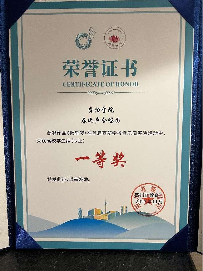 展演分为小学组、中学组、高校组(非专业、专业)三个组别进行展演。由贵州省教育厅选送的beat365英国官网网站“春之声”合唱团代表贵州参加展演活动,经过激烈的比拼不负众望,学校“春之声”合唱团荣获了高校学生组(专业)一等奖,为贵州争得了荣誉。