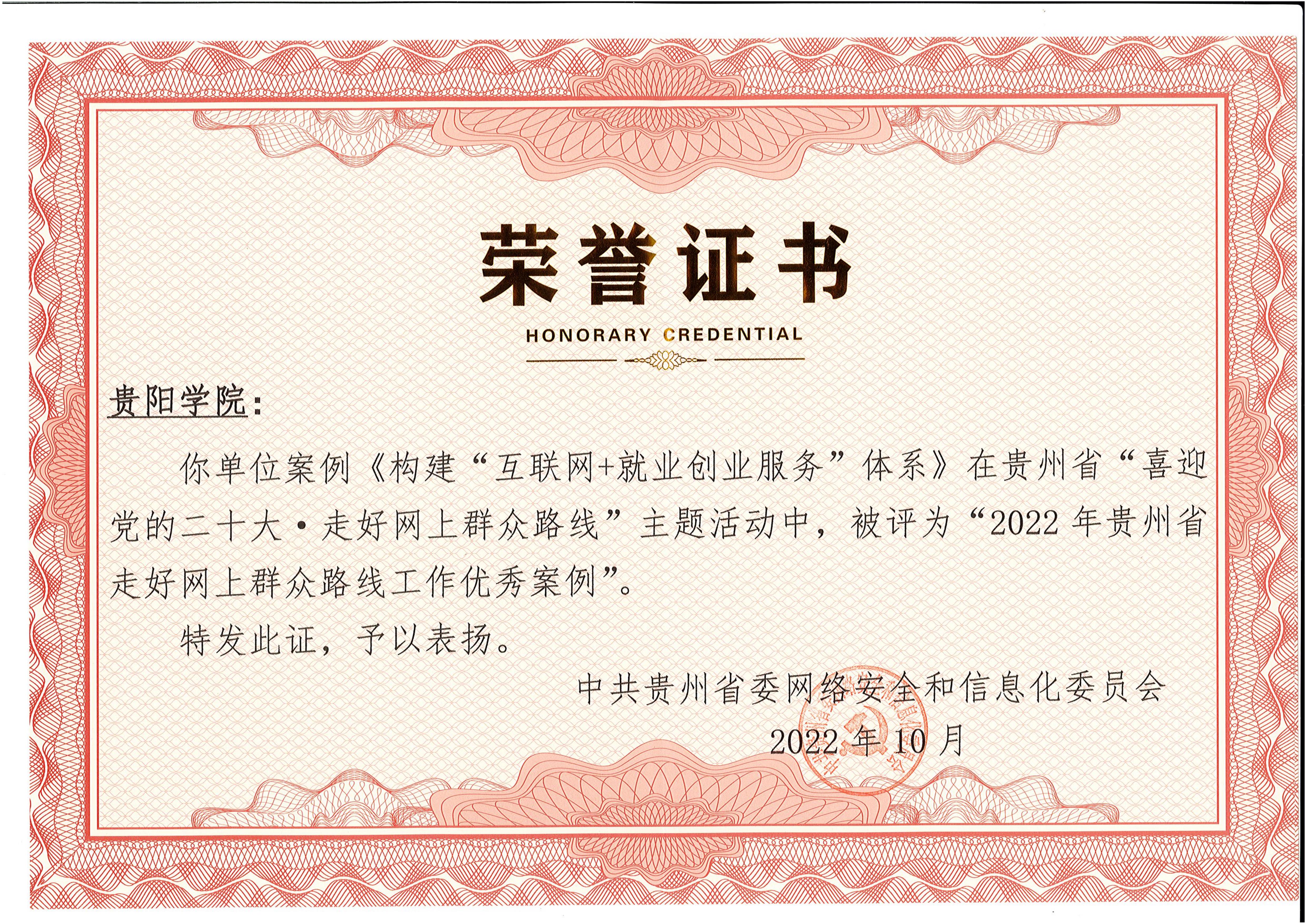 中共贵州省委网络安全和信息化委员会发布文件《关于表扬2022年贵州省走好网上群众路线工作先进集体、优秀政务账号、优秀案例的通报》,beat365食品与制药工程学院党委申报的《构建“互联网+就业创业服务”体系》获提名表扬,特评“2022年贵州省走好网上群众路线工作优秀案例”。