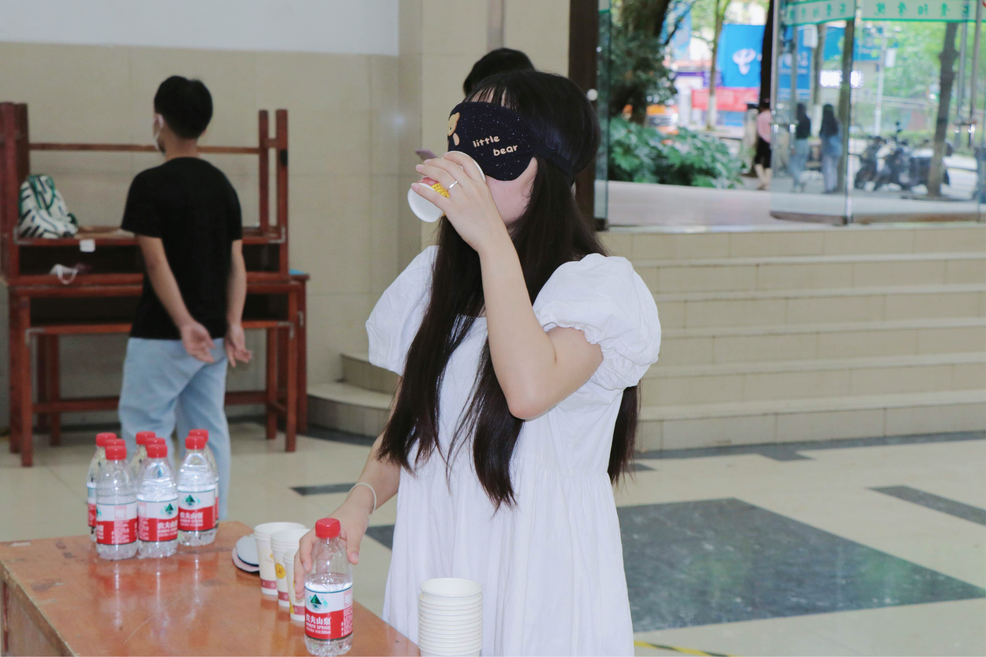 本次活动设置了残障互助、体验盲人生活中具备的基础技能(“盲人收纳”“盲人倒水和喝水”)等环节。在“盲人收纳”这一游戏环节中,同学们体验了蒙眼挑战,通过摸物品形状感知物品形状,凭借触觉判断将物品摆放到指定位置。在残障互助环节,一位“视觉障碍”者和一位“语言障碍”者为一组,需两人共同合作、相互扶持才能到达终点。