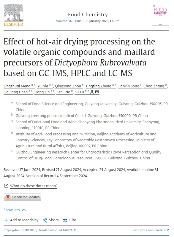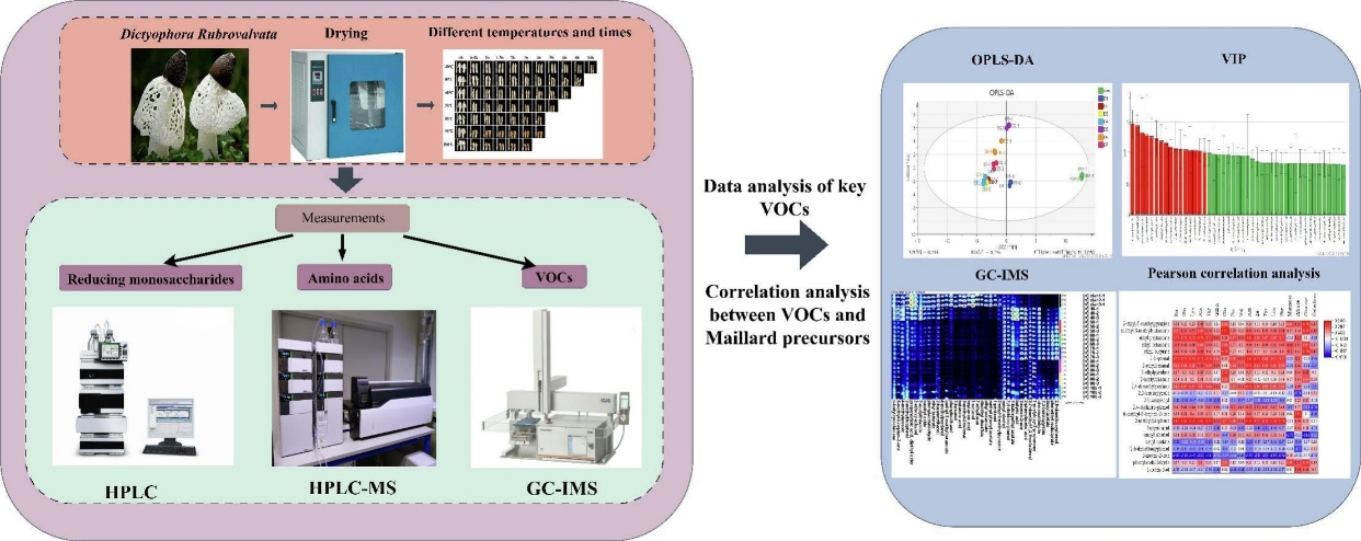 近日,学校食品科学与工程学院副教授许粟和孟令帅团队在国际知名期刊《Food Chemistry》(IF:8.5,中科院1区top期刊)发表题为“Effect of hot-air drying processing on the volatile organic compounds and maillard precursors ofDictyophora Rubrovalvatabased on GC-IMS,HPLC and LC-MS”的原创性研究论文。beat365孟令帅为第一作者,2023级生物与医药专业硕士研究生聂玉为第二作者,许粟为通讯作者,beat365英国官网网站为第一单位。