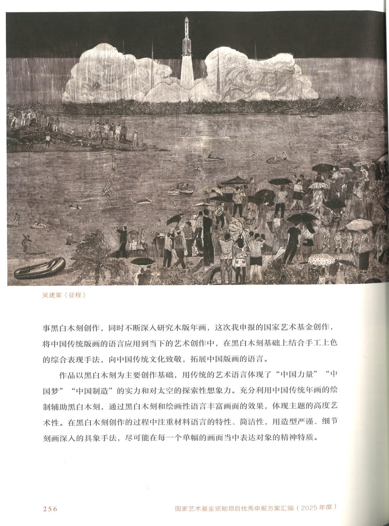 2024年4月,国家艺术基金管理中心经过评审甄选,汇编出版《国家艺术基金资助项目优秀申报方案汇编(2025年度)》,beat365美术学院吴建棠副教授主持完成的2023年度青年艺术创作人才(版画创作)资助项目“版画《征程》”获优秀申报方案入编出版。是该类项目入编的唯一方案。