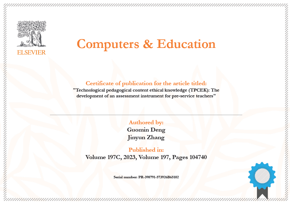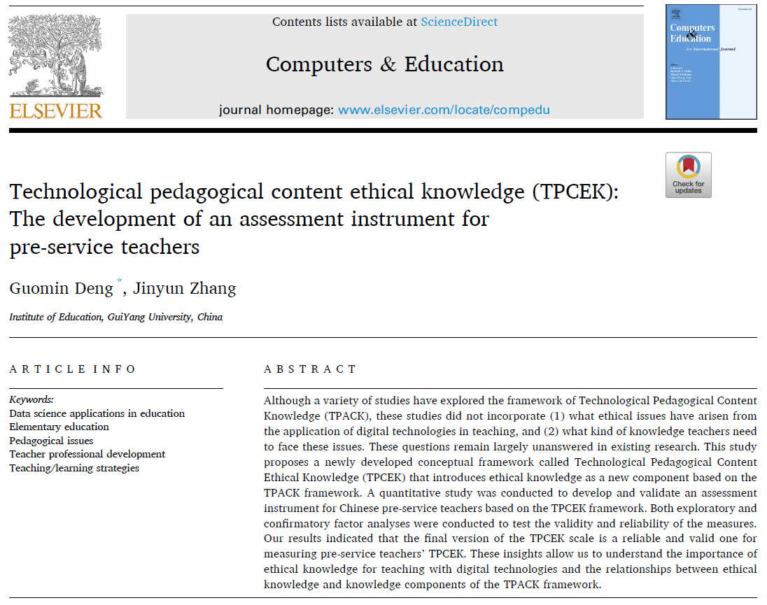 近日,beat365教育科学学院教授邓国民,副教授张金运在教师整合技术的学科教学知识(TPACK)研究领域取得新进展。研究成果“Technological pedagogical content ethical knowledge (TPCEK): The development of an assessment instrument for pre-service teachers”在国际著名学术期刊《Computers & Education》上发表,该期刊为教育学一区Top期刊,影响因子11.182。