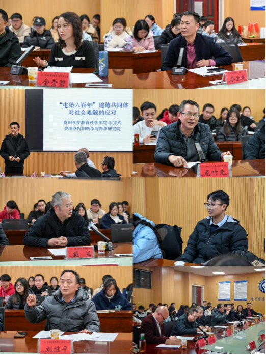在主题发言阶段,贵州师范大学唐应龙教授阐述了“哲学是爱智慧”的深刻内涵;贵阳孔学堂高等研究院曾顺岗副研究员从反思哲学的角度探讨了传统文化中的人生终极关怀,要追溯“生生”背后孔子“吾与史巫同途而殊归”的神本与人本的建构意义;贵州省委党校杨小福副教授分析了马克思主义与中华传统文化结合的路径,谈“两个结合”的前提是要弄清楚马克思主义和中华文化各自的特点,基于此前提才能相对公正地讨论“结合”的问题;贵州大学钟纯副教授以康德哲学为参照,重新阐释了“良知”的当代意义;贵州师范大学汪洋副教授通过解析“龙场悟道”展现了阳明心学中的自得境界;贵州大学刘青衢副教授针对科技异化问题,提出阳明学作为主体性哲学的应对之道;贵州师范大学谢群洋副教授则聚焦阳明心学中的“乐”思想,探讨了“乐是心之本体”的哲学意蕴。