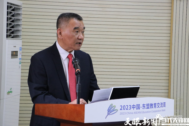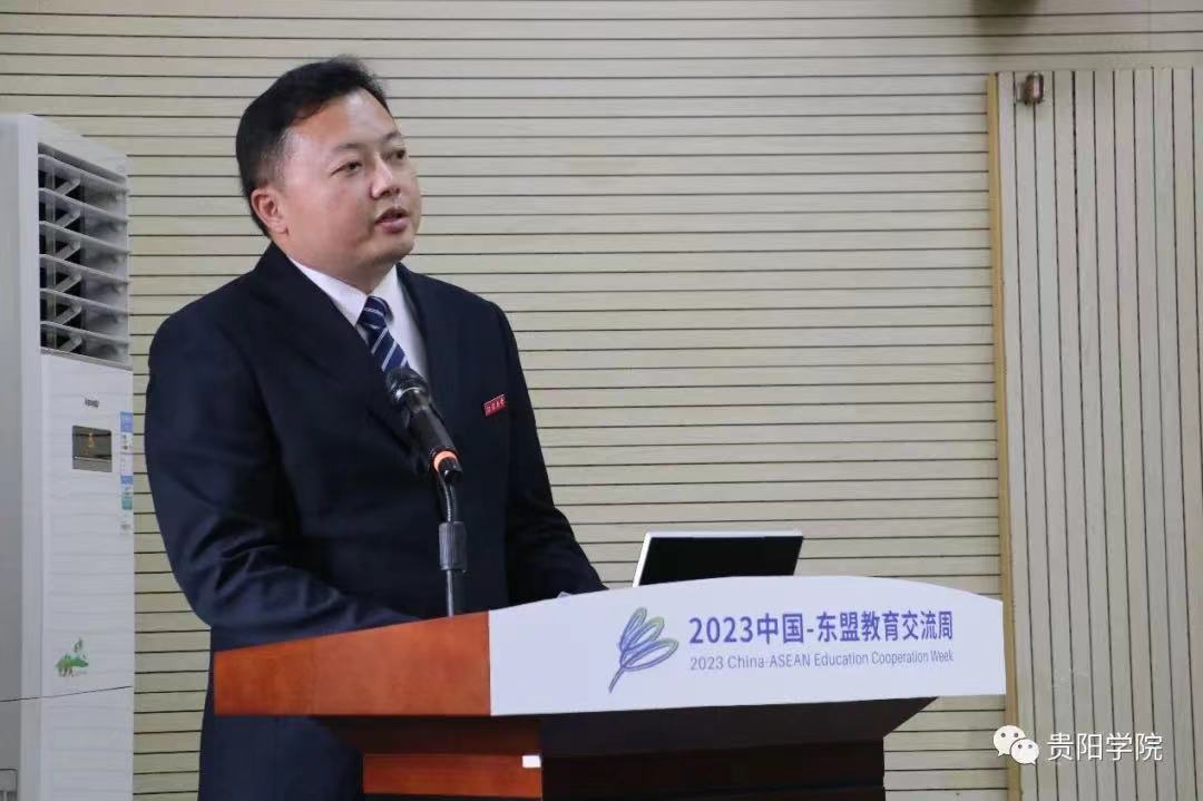 中泰高等教育合作联盟秘书长鄂学文致开幕辞。“本次‘中外学子交流论坛’结合‘知行贵州’丝绸之路青年交流计划,为参加本次活动的学生们提供了感知贵州、了解中国的机会,为中外学生提供了一个相互学习、交流互鉴的平台,得到了参与学生的欢迎。”论坛开幕式上,鄂学文对论坛的举办表示祝贺。鄂学文表示,期望广大中外青年学子利用这次活动的机会广泛结交朋友,交流思想,建立友谊,凝聚共识,并亲身体验大美贵州和悠久中华文化的精髓,做构建人类命运共同体的推动者和建设者。